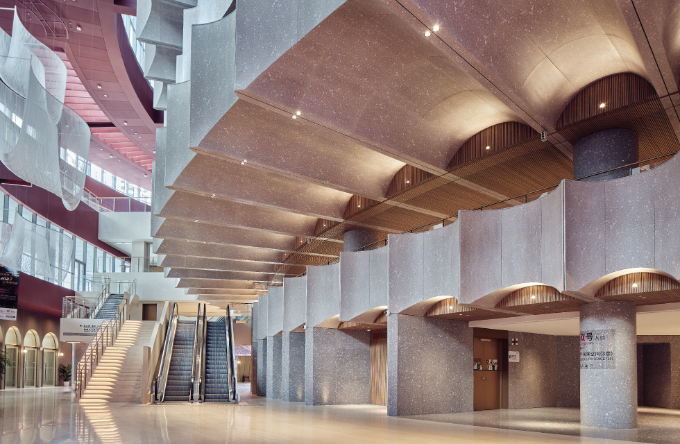 在大劇院場(chǎng)外的挑高回廊,WAC在原有的Plana Pro系列筒燈基礎(chǔ)上為項(xiàng)目特別定制了兩款筒燈。走道頂部,定制款雙頭筒燈實(shí)現(xiàn)了下照+洗墻的二合一,既能保證走道的功能性照明需求,同時(shí)墻壁細(xì)節(jié)的紋路設(shè)計(jì)等在均勻的洗墻光線下,更顯溫潤(rùn)的美感。