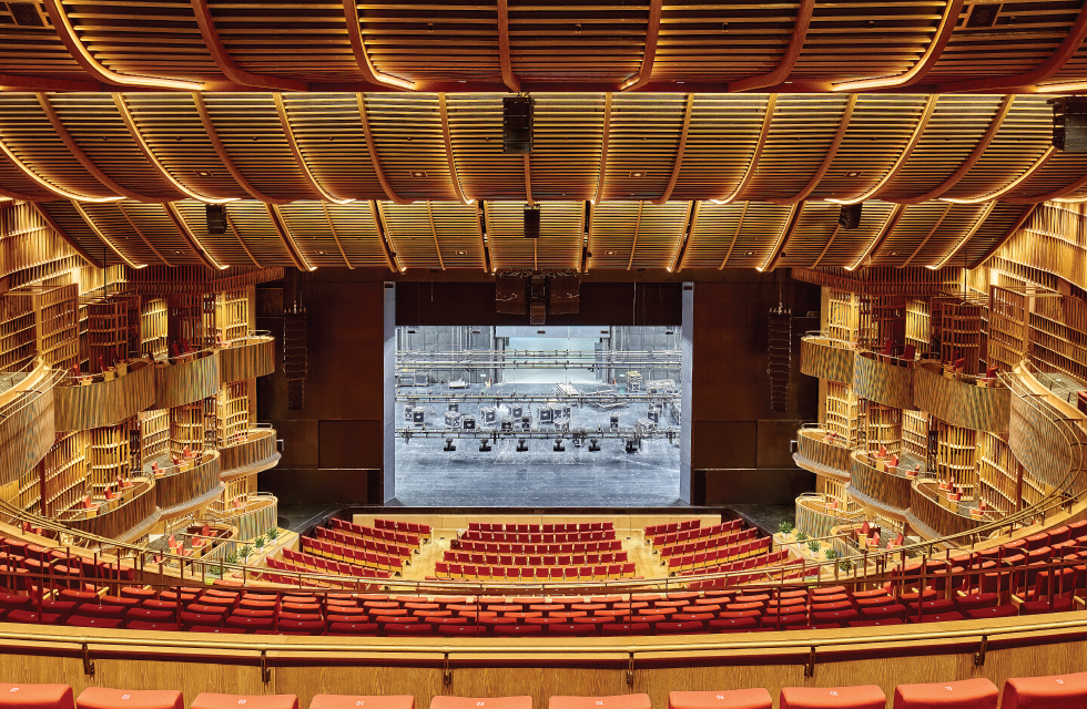 古銅色的線條從外至內(nèi)將空間的氣場(chǎng)貫通,走進(jìn)劇場(chǎng)內(nèi)部,則是超乎想象的豪華質(zhì)感,在摩登的造型設(shè)計(jì)中,勾勒出震撼的經(jīng)典劇院視覺。建筑設(shè)計(jì)汲取中國(guó)古典折扇元素,融合中西美學(xué),古銅色的線條貫穿整個(gè)空間,在高品質(zhì)燈光效果的映襯下,氣勢(shì)磅礴。同時(shí)為配合演出效果的展現(xiàn),室內(nèi)所有燈光均可獨(dú)立編程,木質(zhì)墻壁中定制的WAC HLSE系列硬燈條,1米4段DMX控制,實(shí)現(xiàn)不同的戲劇氛圍效果。