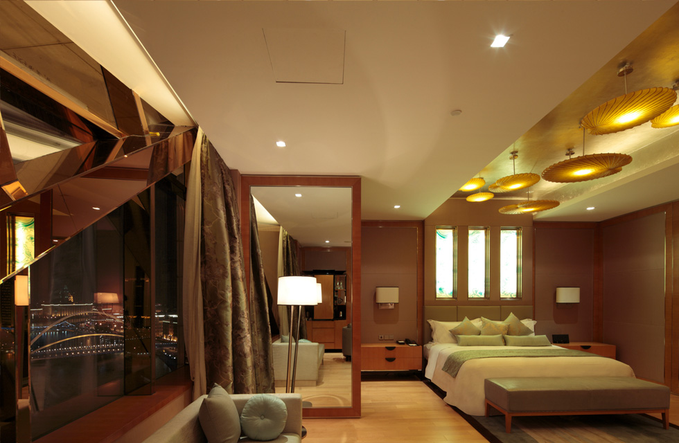 酒店暗朱紅的木質(zhì)墻壁中,嵌入LED展示燈,熨帖墻面錯落布局,散發(fā)出的妖嬈柔光如綻放的朵朵花瓣,釋放著夜的柔美芬芳。