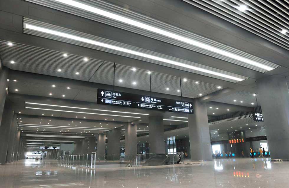 南京南站候車大廳內(nèi)設(shè)置有大型機(jī)場(chǎng)才廣泛使用的自動(dòng)步道。在如此巨大的挑高空間里,設(shè)計(jì)師選用了WAC SLANA 明裝筒燈系列產(chǎn)品。